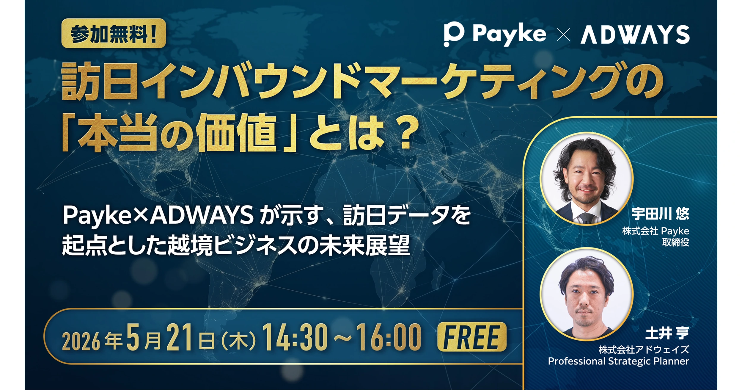 | 登壇者 | 株式会社Payke 取締役 宇田川 悠氏 株式会社アドウェイズ 海外&コンテンツグループ グローバルマーケティングDivision Professional Strategic Planner 土井 亨 |