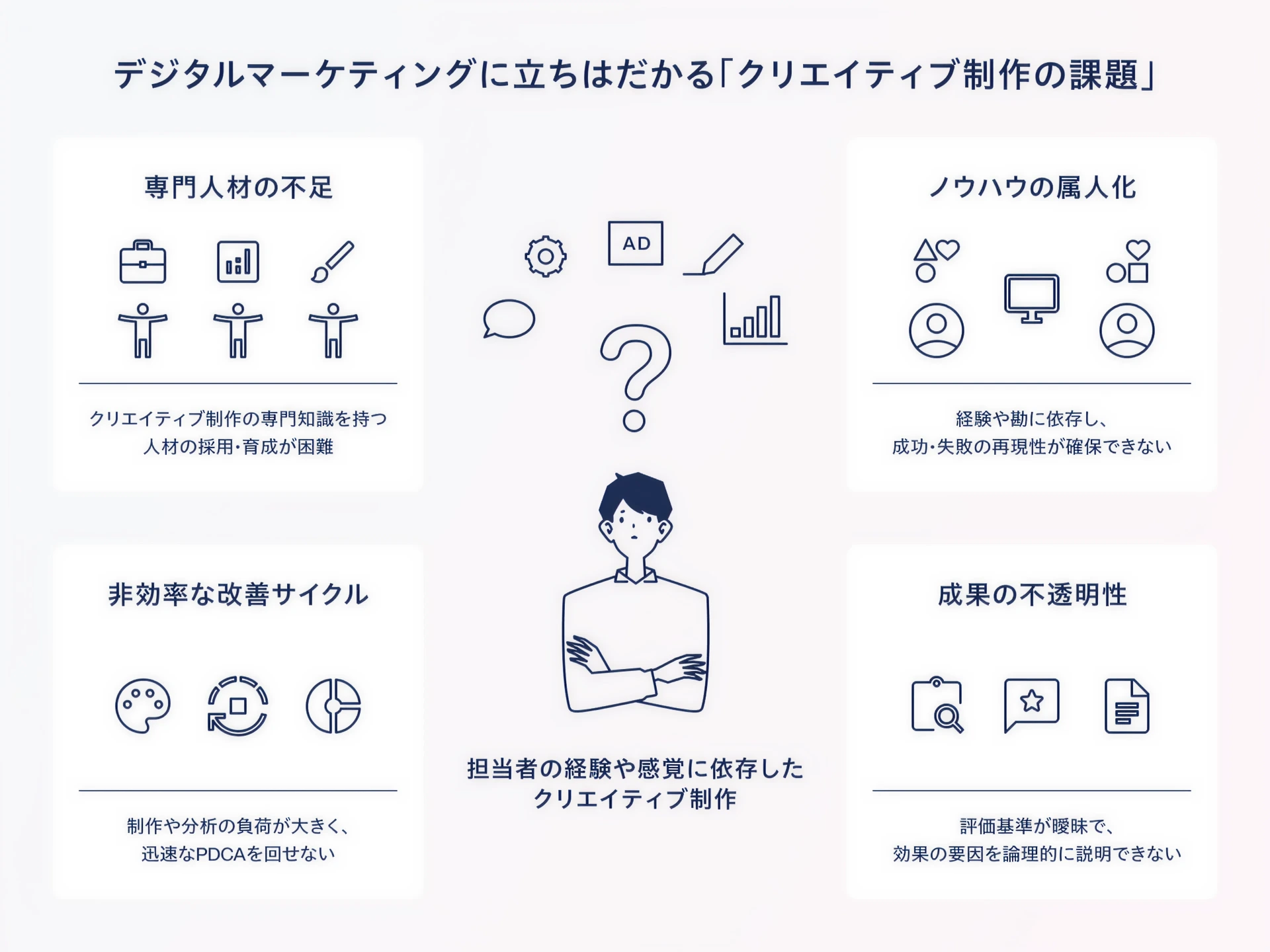 デジタルマーケティングは、飛躍的な進化を遂げ、企業のマーケティング活動を効率化しました。しかし、その一方で広告効果を大きく左右するクリエイティブ制作の領域は、いまだ属人化やナレッジの分散、制作スピードの不均一といった課題を抱えています。特にインハウスでデジタルマーケティングに取り組む企業では、限られた人員体制の中でクリエイティブ制作を行うため、こうした課題がより顕著に表面化しています。