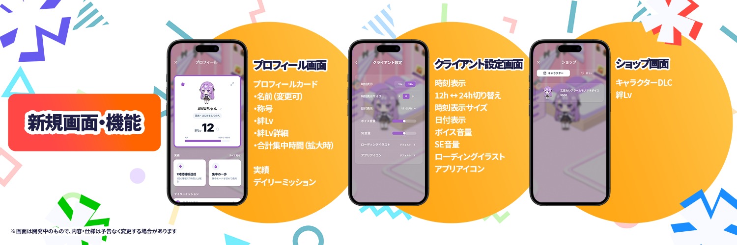 ポモドーロタイマーやストップウォッチを活用した「集中・作業トラッキング」や「睡眠管理」機能を搭載し、推しのVTuberたちがユーザーの日常に優しく寄り添い、毎日のタスクや睡眠の習慣化を楽しくサポートします。