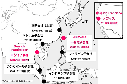 株式会社アドウェイズ(本社:東京都新宿区、代表取締役:岡村陽久)は、台湾のインターネット専業広告代理店大手JSmedia社(台北市、代表取締役:Jason Yang 以下、JSmedia)と、タイのインターネット広告代理店・検索エンジン最適化サービス事業者Search Maximizer社(バンコク市、代表取締役:Pravit Anuvatesirikeat 以下、Search Maximizer)の株式を取得し、子会社化いたしました。 拡大成長著しいアジア各国のネットビジネス市場への事業展開を更に推進するとともに、日本・中国・台湾企業の世界展開も積極的にサポートしてまいります。 当社は中国において、2005年より成果報酬型広告サービス「CHANet」を現地企業に提供し、中国のネットマーケティングをリードしてきました。台湾においても、昨年12月に「台湾Yahoo!(Y! 奇摩)」と提携して検索連動型広告導入支援サービスを提供しておりましたが、今回JSmediaの子会社化により、中国・台湾の両マーケットをまたいで、日系および台湾企業を中心に、ネットマーケティングサービスを提供してまいります。 台湾ではインターネットの世帯普及率が82.5%※1、スマートフォンの普及率も2011年中に34%※2が見込まれ、アジアの中でも高水準になっています。今後JSmediaから、当社のインターネット・スマートフォン広告を提供していく予定です。 また、東南アジア地域では新たにタイのインターネット広告代理店Search Maximizer社の株式を取得し、東南アジア地域全域にサービス網を広げました。今後、タイにおいても、検索連動型広告・成果報酬型広告サービスを中心に、現地を対象としてネットマーケティングサービスを提供してまいります。 今後、東南アジアでの基盤を固めるため、スマートフォン広告事業とスマートフォンアプリ事業を展開の主軸におき、今月中国でサービスを開始したCPI(インストール課金)型スマートフォン広告「AppDriver」を5月に台湾で提供開始、その他東南アジア各国でも今後展開していく予定です。また現在日本で提供しているスマートフォンアプリも、東南アジアで配信していく予定です。 ◆アドウェイズの北米・アジアの各拠点 ![]() ■設立子会社 <台湾>