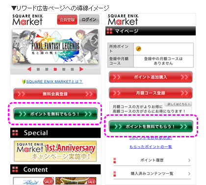 当社では、「SQUARE ENIX MARKET」利用者にリワード広告を提供することにより、同サイトの収益向上をサポートしていきます。 ※リワード広告 アプリを利用するユーザーが、アプリ内の広告にて、新規アプリへの登録やスポンサーサイトでの商品購入など、アクションを起こすことで、そのアプリ内で使う通貨やポイント、アイテムを得る仕組みのこと。 ■ポイントについて 「SQUARE ENIX MARKET」 内で使える仮想通貨サービス。 各アプリタイトルで遊ぶには、無料会員登録を行った上でポイントが必要となる。 □■□株式会社アドウェイズについて http://www.adways.net/ 2001年設立。国内最大級の広告主を有するモバイルのアフィリエイトプログラム「Smart-C」の運営を始め、PC媒体向けアフィリエイトプログラム 「JANet」の運営、スマートフォン向け広告サービス「AppDriver」の運営、アプリ/コンテンツの企画・開発・運営など多彩な事業を展開。子会 社の愛徳威広告(上海)有限公司においては中国でのインターネット広告事業を展開。2006年に東証マザーズ上場。