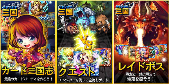 | 三国志の英雄たちがカードで復活! 悪者によって封印された伝説の三国志の武将達を呼び覚まし、強力な武将カードを集めて最強軍団を作り上げよう。 |
