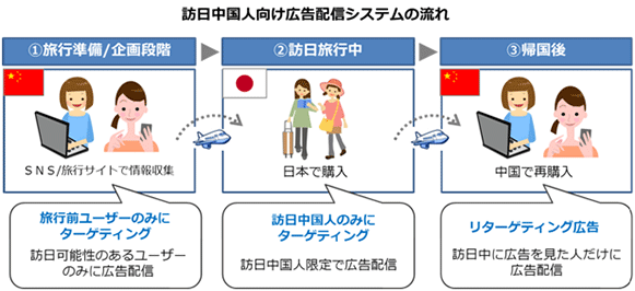 本システムは、『PC/モバイル端末で使用されている(OS)言語が中国語×日本IPアドレスからのアクセス』というターゲティングを行うことで「訪日中」の中国人を選定し、さらにこの度連携を行った中国キャリア大手数社のDMP(Data Management Platform)※が保有する膨大なマーケィングデータを用いることで、「訪日前」「訪日中」「帰国後」と包括的な広告配信が実現いたします。現在、2014年訪日中国人の90%以上にあたる約220万人への配信が可能です。