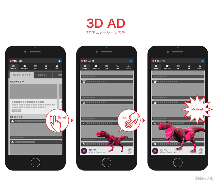VR/ARのコア技術である3DCGを広告素材として配信できるスマートフォン/PC向けのアドネットワーク。タップやスクロール、ジャイロ操作にインタラクションを設定することができ、今までにないインタラクティブ体験とリッチな表現が可能。また、広告枠は3D素材を際立たせる特殊な枠を用意しており”AR”のような実在感を演出。ユーザーに広告をコンテンツとして楽しんでもらう工夫を凝らす。